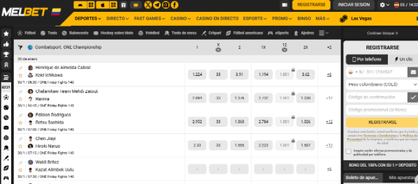 En MelBet Colombia, cada combate de UFC te dejará pegado del asiento. Aquí, las apuestas online UFC en vivo son una chimba y te meten en el centro de la acción. Imagina apostar en una pelea. La emoción de cada enfrentamiento al hacer MelBet login se multiplica, permitiendo a los aficionados ser parte de cada decisión crítica.